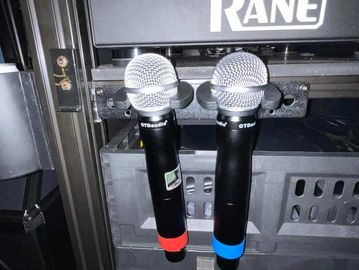 The bracket mounts to the Toadmatic booth. The dual mic holder slips into place The mic easily removes for transport